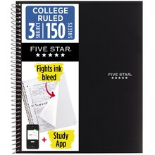Five Star® Spiral Notebook Plus Study App, 3 Subject, College Ruled, 8 1/2" x 11", Black